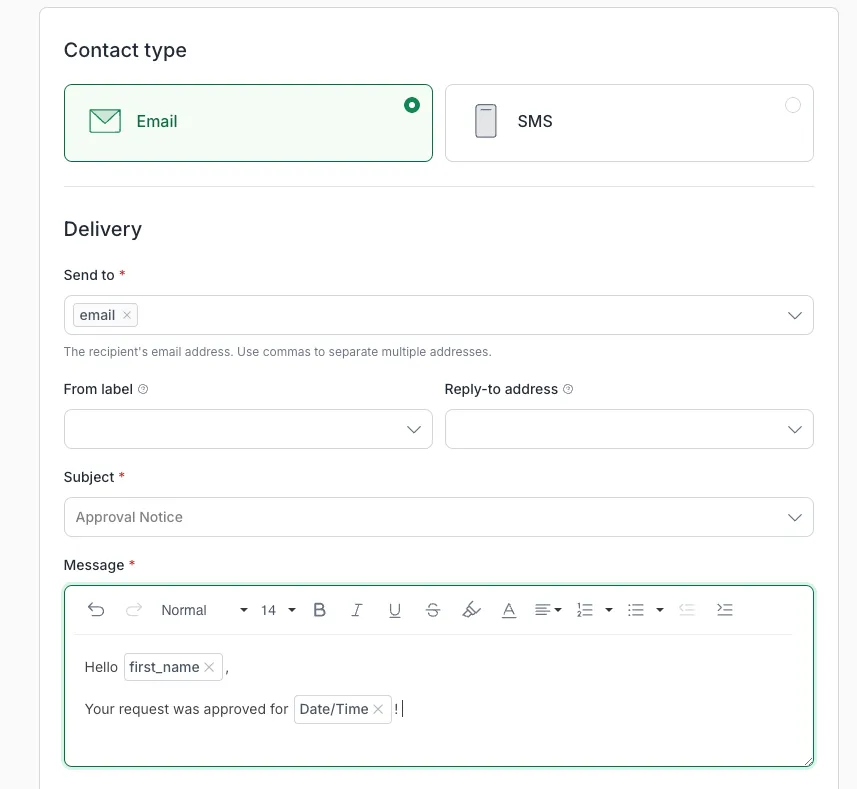 - Dynamic data insertion: Automatically populate messages with workflow data