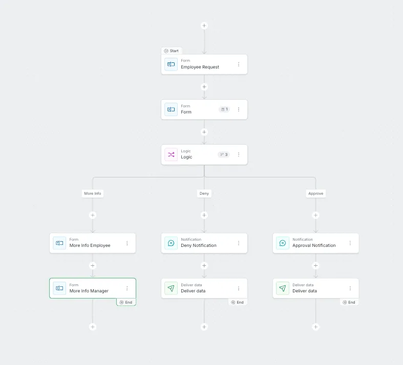 Set up a form Assignment based on the Manager field that routes to the employee's manager. The manager reviews the request details and can approve or deny with a single click.