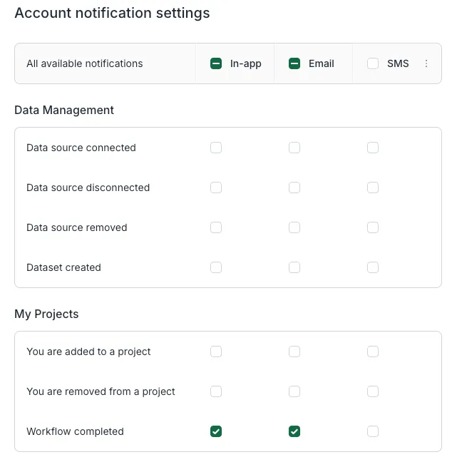 You might prefer SMS for key updates that need real-time visibility—like getting added to a project or seeing a data source break.