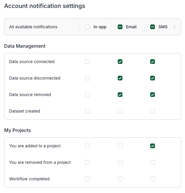 You might prefer SMS for key updates that need real-time visibility—like getting added to a project or seeing a data source break.